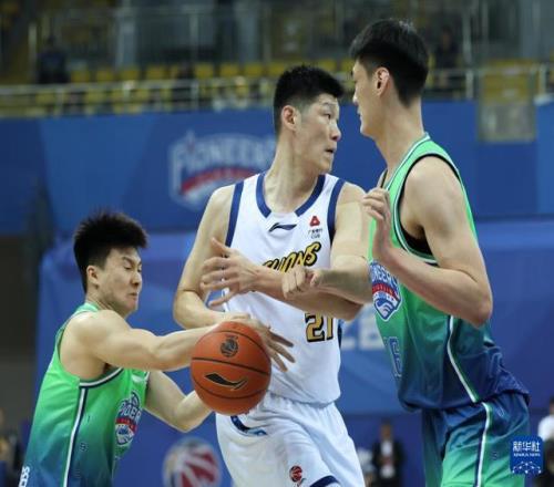 3月24日,浙江浙商证券队球员朱俊龙(左)与赵嘉仁(右)在比赛中防守天津先行者队球员田雨。新华社记者 孙凡越 摄