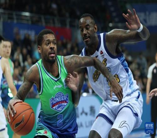 3月24日,天津先行者队球员贾维恩·哈姆雷特(左)在浙江浙商证券队球员贾卡尔·桑普森的防守下进攻。新华社记者 孙凡越 摄
