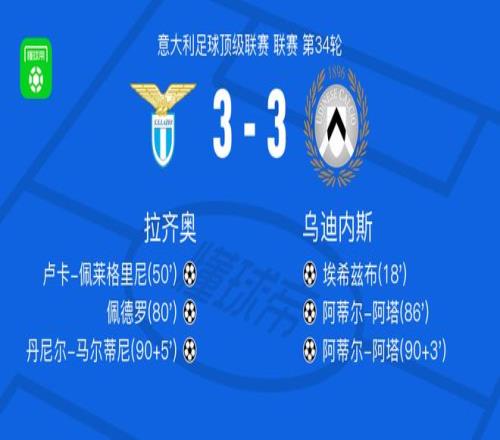 北京时间4月28日意大利足球顶级联赛第34轮,拉齐奥主场与乌迪内斯展开较量。比赛中,乌迪内斯率先取得进球,随后拉齐奥连入两球反超比分,乌迪内斯之后再度进球将比分追平,补时阶段双方又各入一球。最终,拉齐奥与乌迪内斯3-3握手言和。